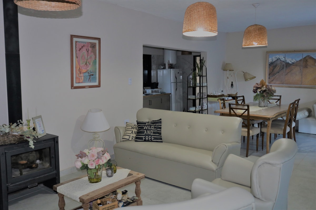 Departamento amplio y luminoso, ubicado en una zona céntrica y tranquila de Chilecito, a pocas cuadras de la plaza principal. Cuenta con dos dormitorios, uno con cama matrimonial y otro con dos camas individuales, además de un cómodo sofá cama en el área de estar. Dispone de cocina comedor totalmente equipada, baño completo y todos los ambientes cuentan con aire acondicionado frío/calor. El departamento se encuentra en planta alta, con acceso por escalera. Incluye cargadores USB y USB-C.
