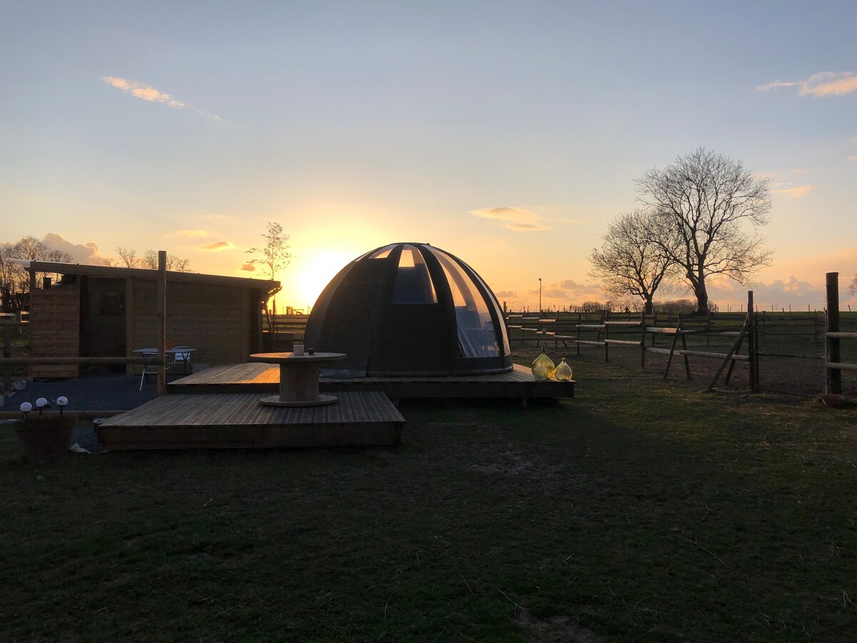 ラ・カノペ・デュ・モンの ようこそ!🌙⭐️💫 フランス製の大きくて美しいドーム、とても美しく装飾されています、 薪ストーブ。🪵 🔥 冬でも暖かさを保証 ❄️ モン・サン=ミッシェルから26km、レンヌから45分の静かな田舎でのロマンチックなひととき。 オプション、2名様料金: - サウナエリアでの45分セッション:45ユーロ - 北欧風呂1時間:59ユーロ 2名様用朝食:29€ 前菜の盛り合わせ、ラクレットディナー、夕食用ピクニックバスケット