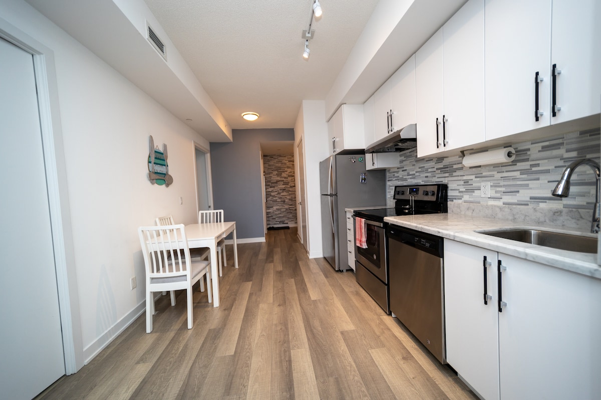 キッチナーのダウンタウンとウォータールーのアップタウンの中心部にある、モダンで洗練された1 +1アパート。モダンな家具、設備の整ったキッチン、夕日が素晴らしい景色のバルコニーが特徴です。ボーリング場、スパ、ビリヤード台、ハイドロスイミングプールなどの特別なアメニティをお楽しみください。アパートには快適なベッドが2台あり、3名様が快適にお休みいただけます。 トップクラスのバーやレストランから数歩の場所にあるこのアパートは、豪華さと利便性を兼ね備えています。出張やレジャーに最適です。