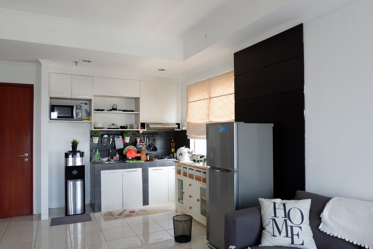 イーストジャカルタの中心部にあるショッピングモールの上にある、新しく居心地の良い装飾のスタジオフラットです。クニンガンと中央ジャカルタから近いエリアにあります。お手頃価格で最高の宿泊先です! ダブルベッドサイズ、スマートテレビ( Netflix)、高速Wi-Fi、温水シャワー、設備の整ったキッチン、24時間365日対応のセキュリティ。 当社のワンルームアパートは、銀行、レストラン、ランドリー、スーパー、映画館にも近いです。 プール、ジム、バスケットボールコートもご利用いただけます。