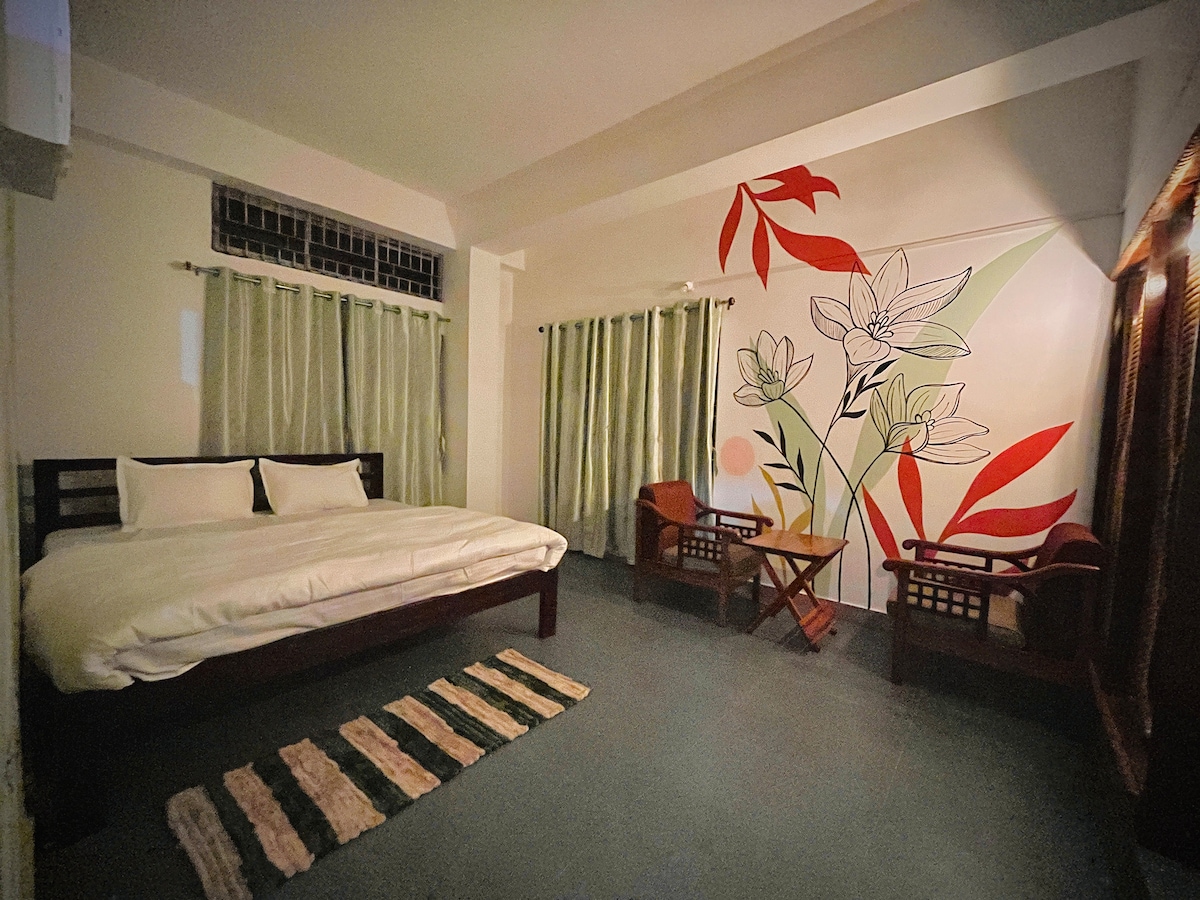 必要なアメニティ・設備と駐車場をすべて備えたフルアパート。メインタウンから1.5km/1マイルの距離にあります。1日中円滑なコミュニケーションが取れます。クイーンベッド1台、ダブルベッド1台、キッチン、リビングルーム。政府発行の有効な身分証明書を持つ未婚のカップルに優しい。 追加料金のサービス:1)送迎。 2)アースヨガスタジオでのヨガセッションへのアクセス。 3) 焚き火。 4) 2名様以上の場合は追加料金が発生します。 5) ペットがお部屋を汚した場合は、400インドルピーの追加清掃料金がかかります。 まるで自宅にいるような気分になることでしょう。