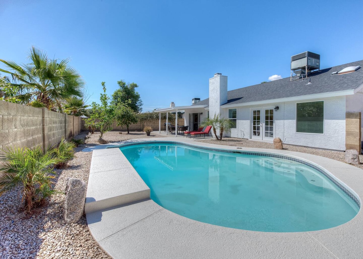 この素晴らしい新しく改装された家はフェニックス北部にあり、近くに高速道路があります。ペットの滞在は無料です! 広々としたベッドルーム3室、バスルーム2室、アーチ型天井のオープンフロアプラン。ご家族やご友人と一緒に、一年中太陽を浴びながら(無料の温水)プールサイドでの食事をお楽しみください。 フルサイズのステンレス製家電と花崗岩のカウンタートップを備えた、設備の整った素晴らしいシェフ仕様のキッチン。私たちは平等をサポートします!