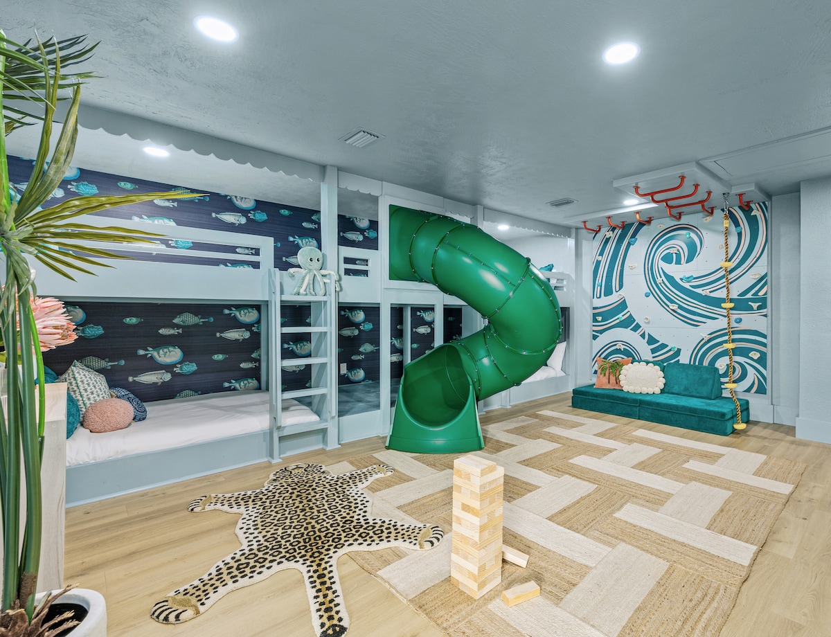 📅 Dates are filling quickly - reserve while you can! **NEW** SUNSET SUITE - a 500 sqft bonus room created for both families and girls trips, featuring: ✨ Custom built-in bunks ✨ Indoor SLIDE + rock climbing + monkey bars ✨ Mrs. Pac-Man, NBA Jam arcade games + photo-worthy neon sign ✨ Nugget Sofa + TV area