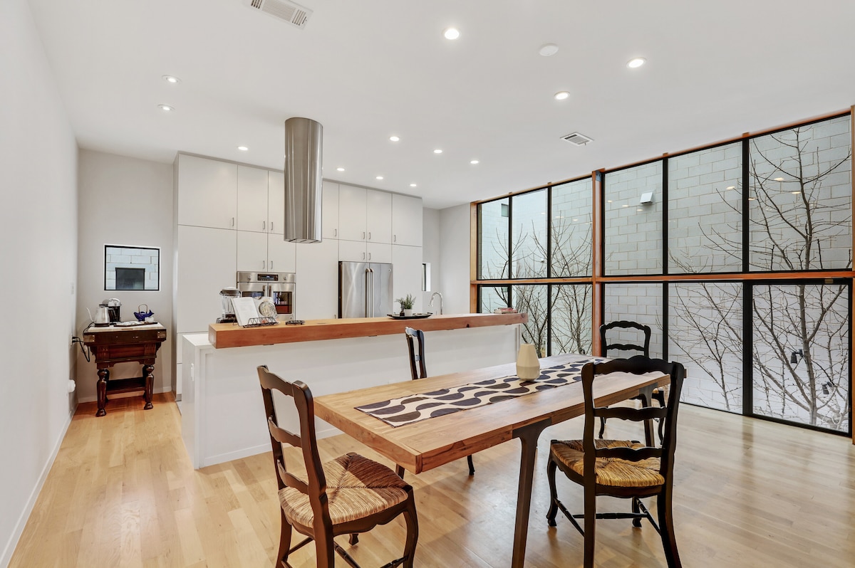 この隠れ家的な豪華タウンハウスで都会の生活を最大限に楽しみましょう! 設備の整った高級キッチンで心ゆくまで料理を楽しんだり、86インチテレビ(YouTube TV、Netflix、Disney + )の前でくつろいだり、裏のパティオでカクテルを楽しんだり、すべてをお楽しみください! 高級リネン(1200スレッドカウントのシーツ、RHタオル、素晴らしいマットレス)、設備の整ったバスルーム、ウォークインクローゼットなど。 出張ですか?高速Wi-Fiとワークスペース用のフルデスクをお楽しみください!