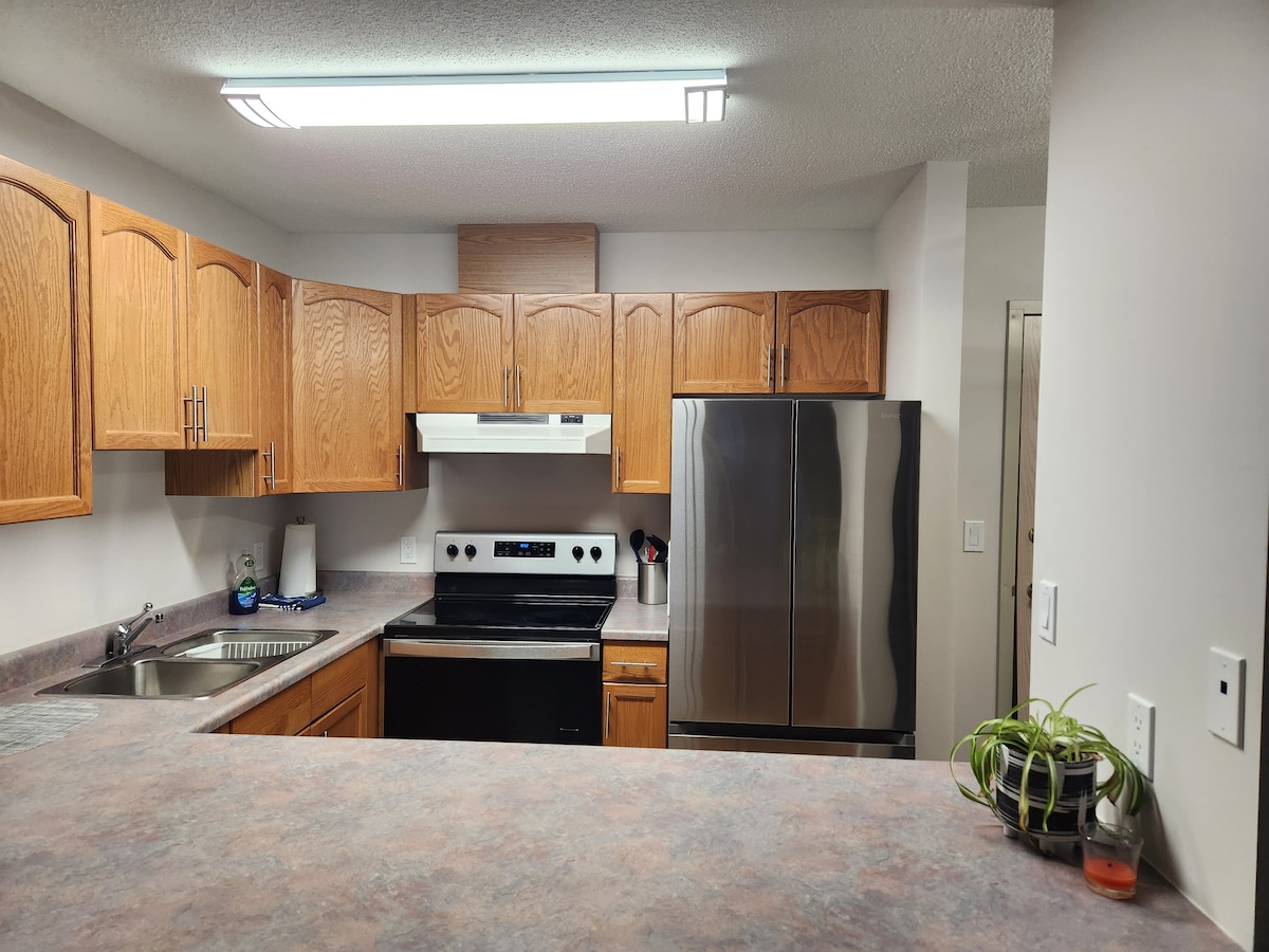 市内中心部に位置するこの高級1ベッドルームアパートは、コンファレンスセンター、コーヒーショップ、ショッピング、食料品店まで徒歩圏内です。 ベッドルームにはクイーンサイズのメモリーフォームマットレスがあり、2名様でご宿泊いただけます。地元のケーブル(50チャンネル以上)とNetflixを備えた55インチ薄型スマートテレビで、のんびりとおくつろぎください。フルキッチンと調理器具を備えており、ご自分のお食事を作ることができます。 滞在料金には無料の敷地内駐車場が含まれています。リクエストに応じて、追加のベッド(エアマットレス)をご用意しております。