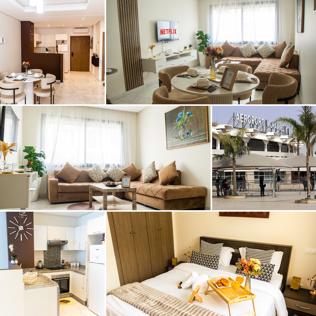 Welcome to your calm and secure stay just 5 minutes from Mohammed V Airport. Perfect for business travelers, families, transit stays, and industrial zone professionals, this modern one bedroom apartment offers fiber optic WiFi 100 Mbps, centralized AC, elevator access, and a spacious balcony in a gated residence with pool. All daily essentials are within walking distance supermarkets, cafés, restaurants, and shops.