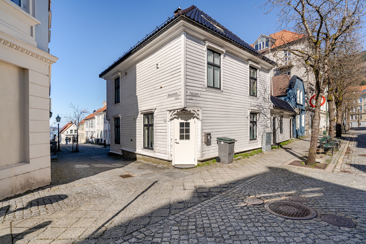 Welcome to the historic Bergen house, dating back to around 1780, located in the charming Sandviken area just a stone's throw from the bustling city center among local residents. You'll have the entire house to yourself, complete with a cozy outdoor terrace. The property is secluded from street noise, tucked away in a small alley. Its convenient location offers easy access to supermarkets, a bus stop, hiking trails, and city bike parking. Additionally, you can find paid street parking nearby.