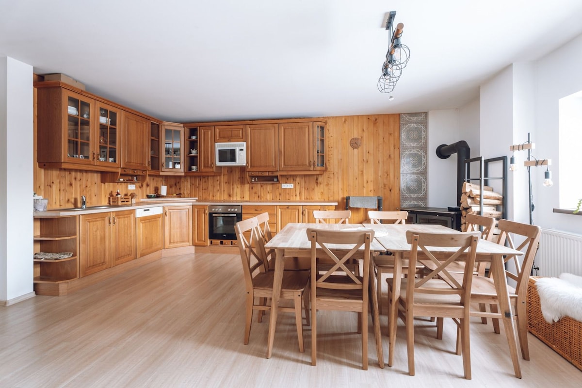 Our Traditional wooden house is situated in the valley of Jeseniky mountains with the picturesque views to its snowy peaks. In the neighborhood are ski slopes, cross country trails and other winter/summer sport centers. In summer, spring and autumn period, guests can combine hiking trips, cycling and swimming in pure water of flooded granite quarries. Find your ideal place for your family holiday and bring your pets to join you :)
