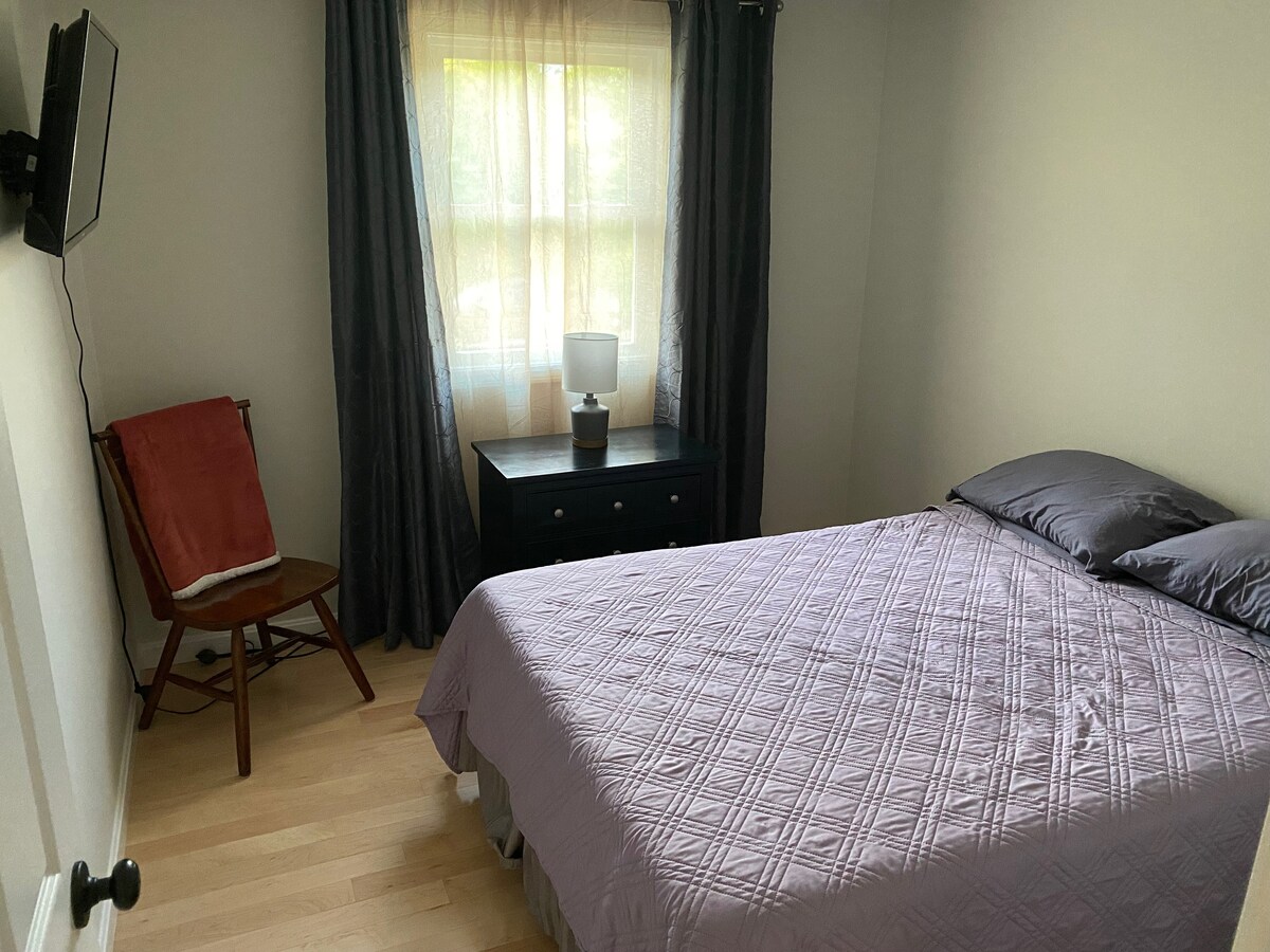 A fully-furnished one-bedroom guest apartment (600sq ft) on two levels attached to our house. Separate entrance. Ensuite-shower and complete kitchen. 3 miles from downtown Edgartown, 5 miles to State Beach. In a peaceful neighborhood abutting miles of state forest trails. WiFi, workspace, laundry, smart TV and air conditioning. It can be difficult to secure a ferry res for your car when planning last minute trips in summer. May we suggest renting a bicycle or use a taxi/ride-share service.
