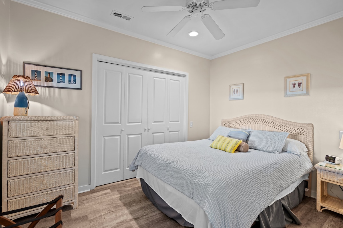 シップラップの壁、ジャグジーバスタブ、ビデトイレを備えた改装済みのマスターベッドルームスイート。 スパのような雰囲気で、お一人様やカップルでのんびり過ごすのに最適です。 ビーチ、ファーマーズマーケット、野外コンサートまで徒歩圏内です。 飲食店まで徒歩圏内。お部屋には2階に専用の玄関があります。大きなスクリーン付きポーチもお楽しみいただけます! Roku TVがあります。新しい寝室の家具と調節可能なベッド付きマットレス。 お子様の安全のための設備はありません。