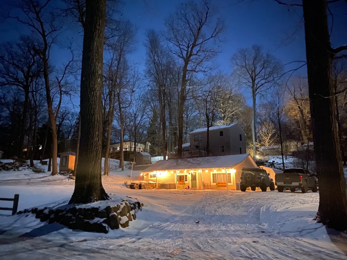 1964年ミッドセンチュリーAフレーム - ロマンチックな休暇。湖まで徒歩すぐ、広い森林地帯、屋外の焚き火台、ダイニング、バーベキューグリル、ホットタブ、自転車。 ジャグジーバス付きの広いバスルーム、広いキッチンと電気暖炉付きのリビングエリアのあるオープンフロア。2階には寝室が2部屋あります。マスターにはクイーンサイズのベッド、ワークスペース、バルコニーがあります。フロントベッドルームには布団が2枚あり、リビングルームを見渡せます。 地下のゲームルームにはサウナ、ビリヤード台、フーズボール、シャッフルボード、ジェンガ、ランドリーがあります。ショッピング、ゴルフ、スキーリゾート、サイダーミルに近い。