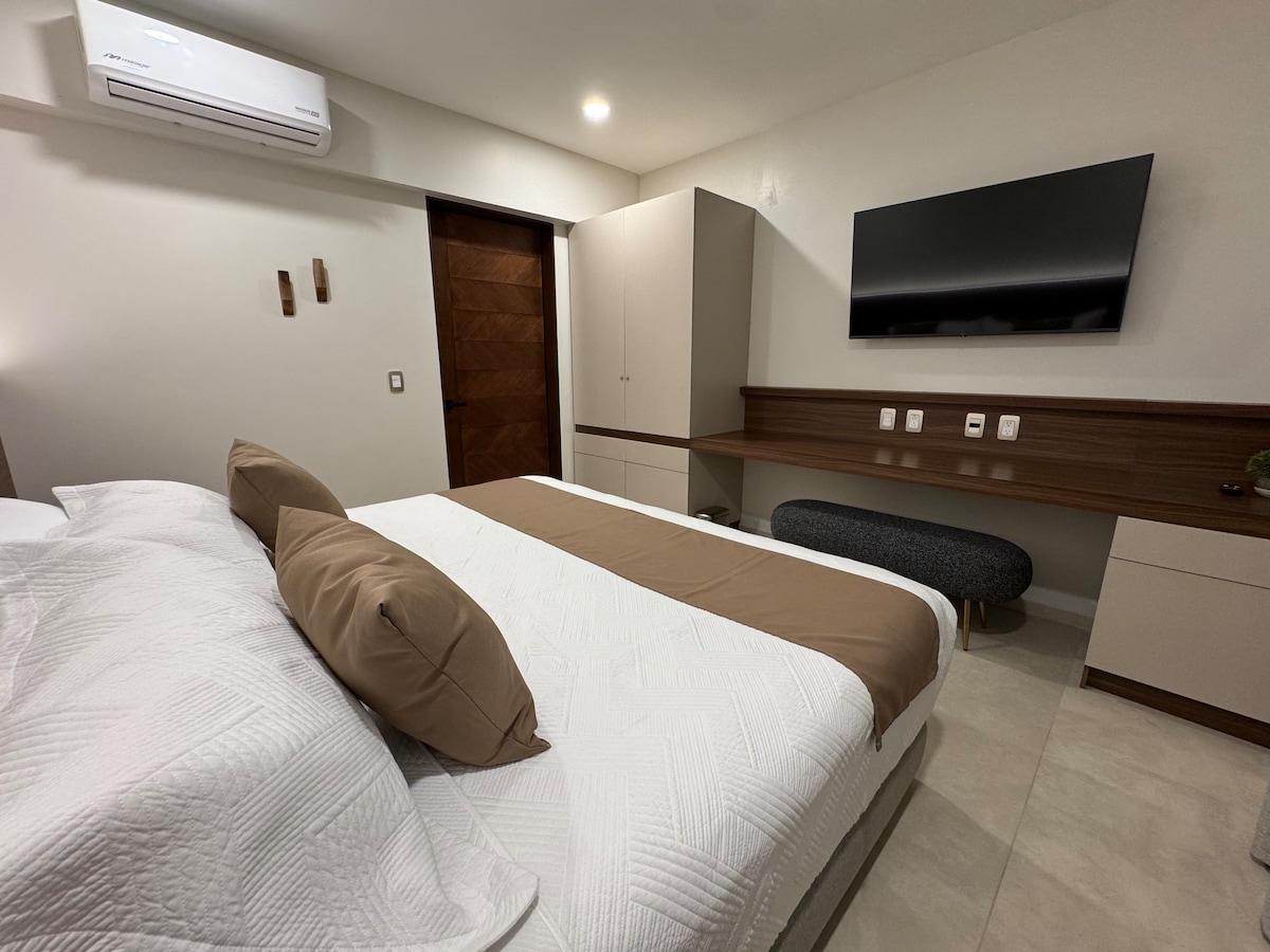 Disfruta del fácil acceso a todo desde este alojamiento perfectamente ubicado y que brinda una estancia tranquila y confortable. El departamento tiene en la planta baja la estancia con sillón, mesa de comedor para dos personas, cocina y baño completo con regadera; escaleras tipo caracol para subir a la planta, donde se encuentra la recamara con cama, closet, aire acondicionado y cortinas blackout, desde ahí se accede a la terraza semi-privada con dos sillas para exterior y sombrilla.