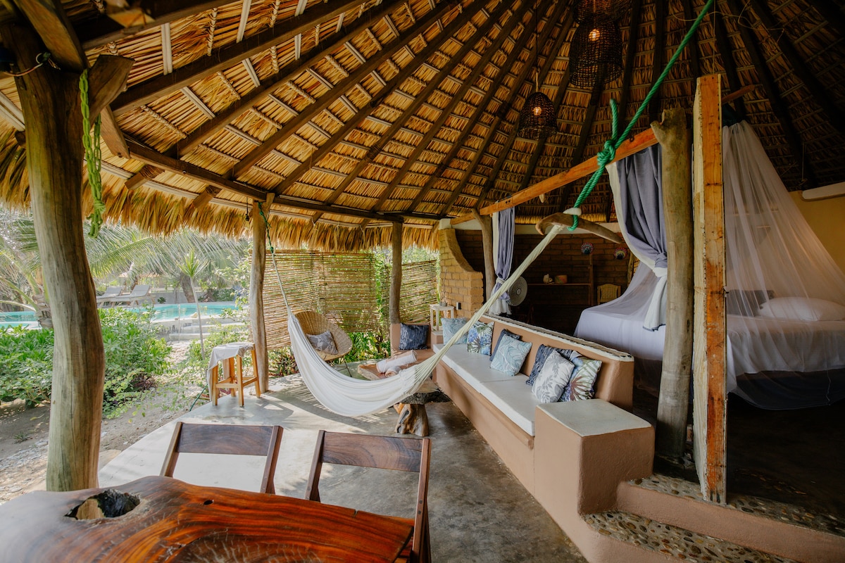 この場所で目覚めることは夢です!家は海に面したビーチのすぐそばにあり、毎日最高の夕日を楽しむことができます。2階建てです。寝室は上部にあり、ワークスペース(Starlink)と休憩用ハンモックもあります。屋根は大きなパラパです。家には小さなプライベートプールがあり、メルメヒタビーチの最高の景色を楽しむことができます。 家は非常に開放的で、風の爽やかさと最高の景色を楽しむことができます。