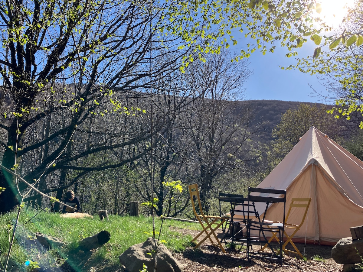 Loin de toute nuisance sonore ou visuelle... Dans un espace privilégié, au sein d’une forêt de Chênes et de Hêtres remarquables, à 5km de magnifiques coins de baignade, à 950m d'altitude et 3km du GR73; Venez découvrir une zone de camping, semi-ombragée sous la fraicheur des arbres. Pour vous est installée une cabane comprenant toilettes sèches et douche chaude. Vous pourrez profiter des légumes et des produits de la ferme (œufs, miel, confiture, crème de marrons et jus de pomme).