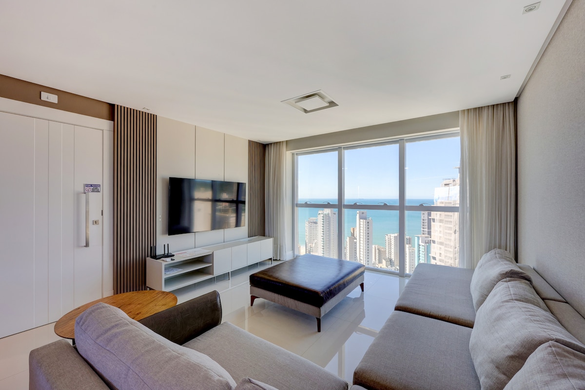 Leia nossas + de 100 avaliações, todas 5 estrelas! Apto completo para até 6 hóspedes: - 1 suÃte+2 quartos (todos c/ ar condicionado e TV, os dois maiores com vista para o mar) - Sala de estar e jantar c/ vista direta para a barra norte - Cozinha e lavanderia totalmente equipadas - Garagem privativa para um veÃculo médio (*) - EdifÃcio frente ao mar na av. Atlântica com vista total da orla na área comum e portaria 24h - Roupas de cama e banho limpos em lavanderia - Pet friendly
