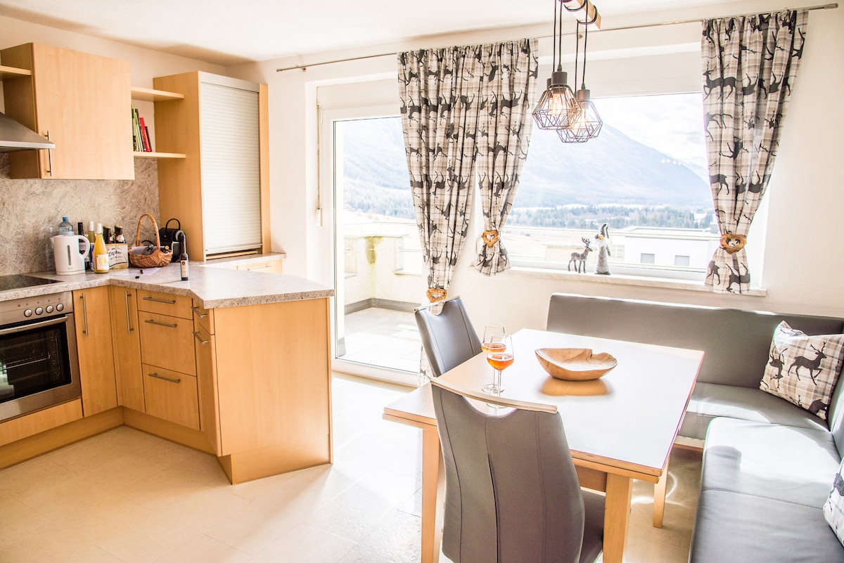 Elegante Penthousewohnung im modernen Alpenstil am Seefelder Plateau. Die gemütliche, ruhig gelegene Wohnung im letzen Stock ist für bis zu 4 Personen sehr komfortabel ausgelegt. Sie verfügt über hellen Wohn-Essbereich mit moderner komplett ausgestatteter Küche, zwei Doppelschlafzimmer, zwei Badezimmer, Bodenheizung, gratis Wi-Fi und eine sehr große private Terrasse. Von dort aus können Sie die atemberaubende Aussicht auf die Berge und das Inntal, sowohl im Sommer als auch im Winter genießen.