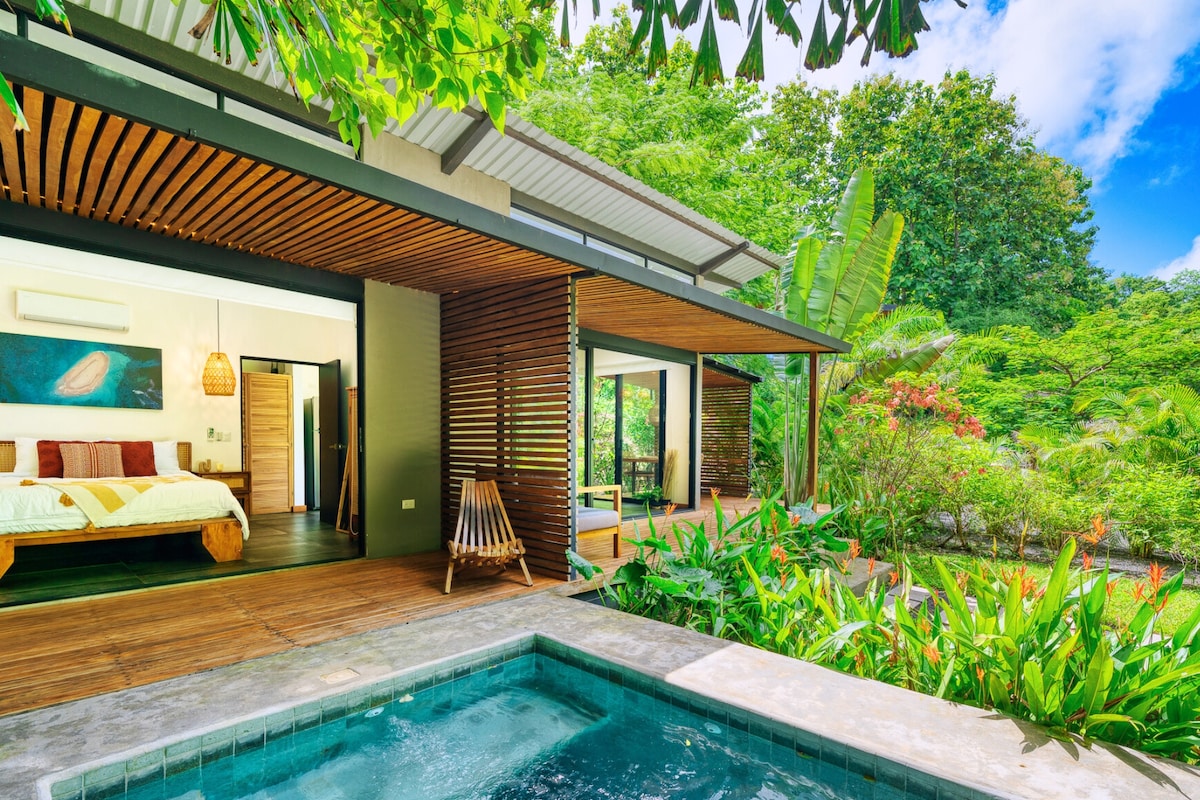 Welcome to Buendía Lux, an ideal retreat for friends, couples, and families looking to unwind and enjoy the natural beauty of Costa Rica. This stunning 2 bedroom suite is located in a beautiful, secluded property surrounded by lush trees, only a 3 minute drive (12 minute walk) away from shops, bars, restaurants, and the beach. Here you can relax by the large designer pool, listen to the monkeys and observe hummingbirds and much other wildlife.