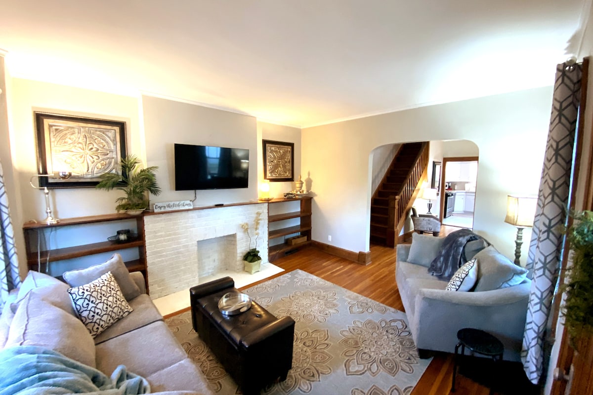 歴史あるクリントンビルにあるこのシックな3ベッドルーム、1バスルームのデュプレックスでリラックスしてください。 各寝室にはキングサイズベッド、高級リネン、遮光カーテン、ハードウッドフロア、シーリングファン、42インチスマートテレビが備わっています。 新しく改装されたバスルームには、ウォークインシャワーがあります。 歴史的なタイルが時代の魅力を保っています。 設備の整ったキッチンには、ガスコンロ、食器洗い機、電子レンジ、浄水器、キューリグ、居心地の良いワークステーションが備わっています。 広々としたダイニングルームとリビングルームは、ユニークな装飾、自然光、落ち着いた雰囲気でくつろぐことができます。