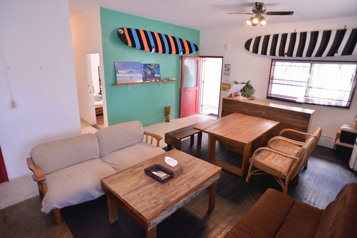 沖縄西海岸、人気エリア北谷町宮城海岸エリアに位置するアメリカンスタイルのシェアハウスです。是非新しい沖縄滞在を楽しんでください。部屋やリビングの家具は、材木を利用したハンドメイドの家具を多く使用しています。木のぬくもり、手作りの温かみを宿泊者の皆様の感じて頂けるように心がけています。ディスプレイにはサーフボードや貝殻、海を身近に感じられるのも魅力の一つです。1日3組様限定、全部屋個室(1〜4名様)なのでプライベート空間もしっかりと守れます。共有スパースで他のゲストの方との交流を楽しむことも、自分の時間を楽しむことも出来るので、安心で快適な時間を過ごすことができます。 沖縄西海岸を代表するサーフポイントで有名な宮城海岸砂辺ポイントまで徒歩3分。海遊びをする方にはもちろん、サンセットタイムにはキレイな夕日を見ることも出来る抜群の立地条件です。宿周辺には観光客や地元客に人気のお洒落なオーシャンビューのカフェやバー、沖縄料理屋も多くあり食事も楽しんで頂けます。徒歩圏内にコンビにもあり立地条件も抜群です。