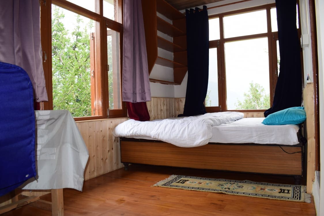 A newly built dedicated double deluxe room standing on the top of the mountain in Manali. It is a private place where only 2 - 3 houses are nearby this place not more than that. This place is unbelievably charming. From your room, you can see the entire valley and the glacier laden Himalayas of Kullu - Manali valley. This brand new double bedded room has attach kitchenette, hygienic washroom, study table, wi-fi and all basic amenities.
