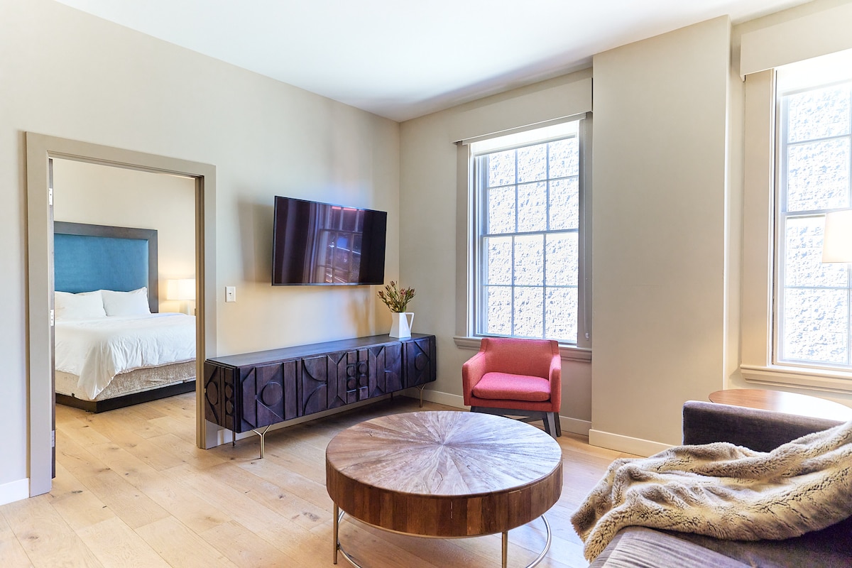 Immerse yourself in the culture of the Old Port at your luxury loft. A top choice for travelers, The Docent's Collection was most recently awarded Condé Nast Readers' Choice (2025) and Tripadvisor Travelers' Choice (2025). Enjoy this spacious open-concept floor plan featuring a full-sized kitchen and bedrooms with soft luxurious linens and cozy pillows for your comfort. Admire the tapestry of a curated collection of local artists and enjoy five-star service from our local hospitality team.