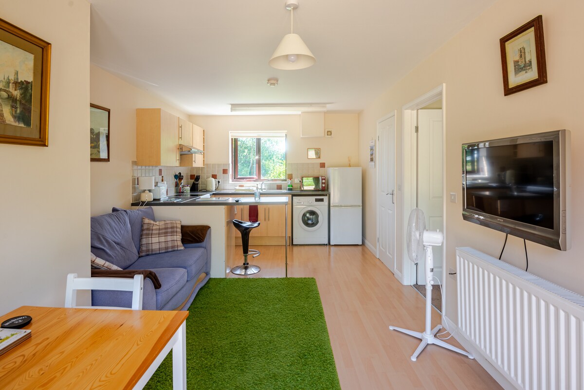 私のフラットは専用玄関があります。 オープンプランのキッチン/リビングルームには、調理器具、電子レンジ、冷凍冷蔵庫、洗濯機、キッチン用品が完備されています。 寝室は独立しており、専用のシャワールームがあります。 アパートのすぐ外に駐車場があります。 座席付きの庭園エリアをご利用いただけます。 このフラットは、主要道路へのアクセスが良い小さな集落の端にある静かな田舎の場所にあります。 周辺の観光スポットにはベルトンハウスがあります。