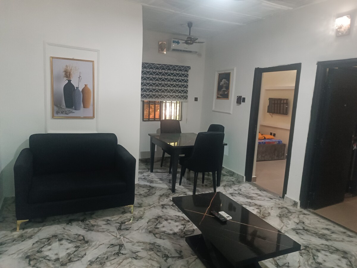 こちらのユニークな宿泊先には、独自のスタイルがあります。 ソーラーエネルギーサポートによる24時間365日の電源、24時間365日の無制限Wi-Fi、24時間365日のセキュリティを完備しています。 ポートハーコートGRAの中心部に位置し、市内最高のレストラン、バー、人気スポットへ簡単にアクセスできます。 このエリアは静かで、安全で、清潔で、完全に安全です。 ポートハーコートGRAの中心部に位置する、平和で清潔な環境で、基本的なアメニティがすべて揃っていますので、リラックスしてご滞在いただけます。