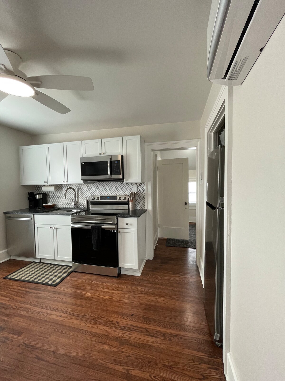 Elegance meets quiet living and plush comfort in this inviting modern office. Our Deluxe Office Guest House is the perfect overnight stay for on-the-go working singles or couples. Featuring a full kitchen, bath, washer & dryer, two work spaces, wi-fi, and TV with electric fireplace and queen size bed.