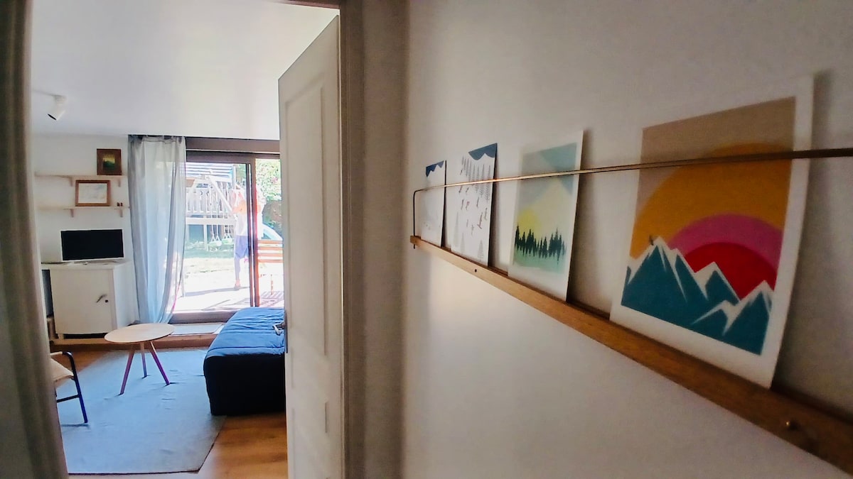 町の中心部に位置する静かな庭園にある小さな1階建てのパビリオン、27平方メートルの新しいワンルーム。 1階:キッチン、バスルーム、独立したトイレ、リビングルーム、ダイニングルーム、ソファーベッド、屋根裏部屋の上の広い寝室、折りたたみ式はしごでアクセス 自転車やスキーの収納可能。 整備された庭のコーナーもあります。 10ユーロはリネンの提供とメンテナンスに関するものです。スタジオの清掃はお客様の負担となります。