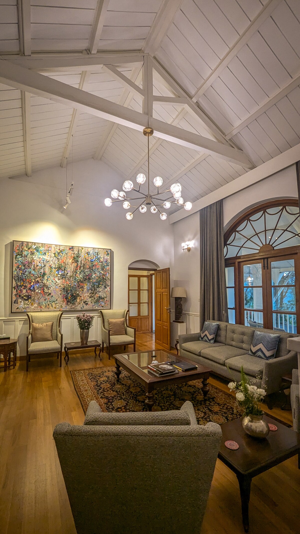 コインバトールから車で2時間のアッパー・クヌールに隠れたHushstay x Milford Estateは、遺産と自然がシームレスに絡み合う隠れ家です。4ベッドルームの植民地時代のバンガローは、ジャカランダの木立の後ろに隠れていて、野花、アジサイ、香り高いバラの庭を歩いて初めて見えてきます。内部には、ヴィンテージのチーク材のインテリア、高い天井、アンティーク調のフランス窓が、過去の物語を語ります。ベランダにはシェブロンタイルの床があります。