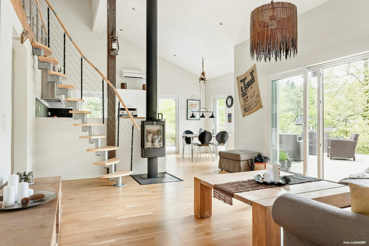 Casa Feliz is a whitewashed stone house where Mediterranean flair meets Skåne nature in a unique way. With large windows in all directions and a ceiling height of over five meters, a bright and airy atmosphere is created that makes you feel at one with nature.