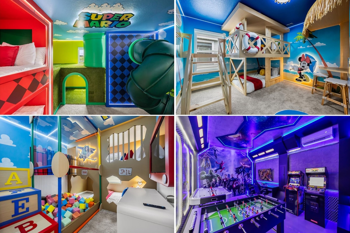オーランド、ディズニー、ゲームセン、映画館、マッサージチェア、プール、ジャグジー、キングベッド2台、キッズ二段ベッド、キシミー。 プライベートホーム内のアップグレードされたゲームルーム、夜の自宅用の劇場、プールとジャグジーを備えた専用ラナイ。 パンプイットアップダンス、スポンジボブレーシング、ナスカーレーシング、レジェンズ3、パックマンのアーケードパーティー、80インチテレビ、Xbox 360からお選びいただけます。 92インチのプロジェクションスクリーン、サラウンドサウンド、スタジアムスタイルの座席でお気に入りの映画をご覧ください。