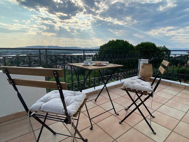 Take it easy at this unique and tranquil getaway. This 2 bedroom 2.5 bath is perfect for a group of 4 to get away and forget the world. Enjoy multiple balconies with unique breathtaking views of the Diaporos islands and Mt. Athos. There is a private little beach at the bottom of the hill that is pebble (warning it is a little bit of a hike). Home is equipped with a kitchen, living room, and dining room. Each bedroom has it's own on suite bathroom. A/C, and screens to keep everyone comfortable.