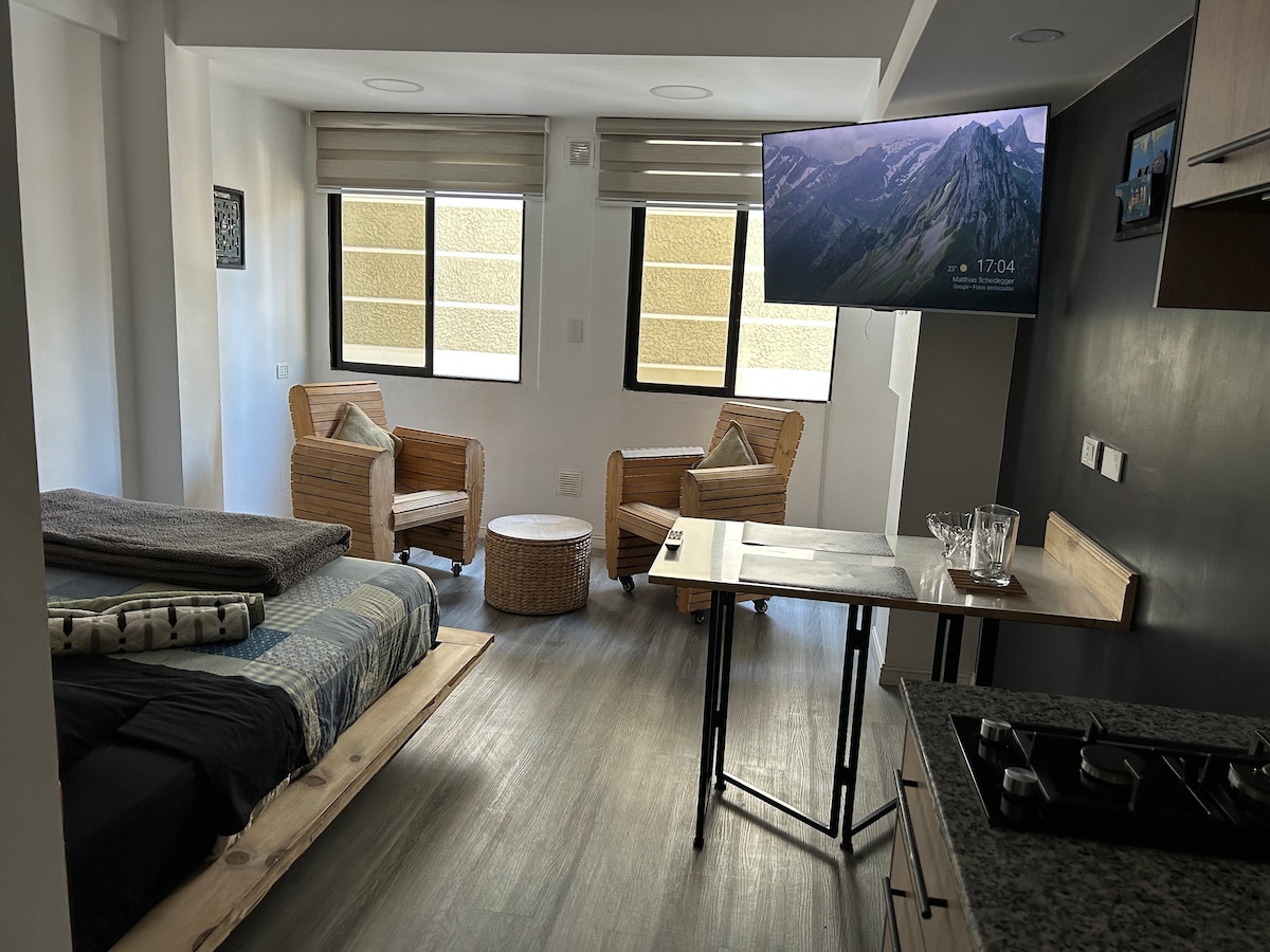 Mondrian Home Studiosへようこそ!3年以上のホスティング経験があり、モダンなワンルームマンションで安全で信頼できる滞在を提供しています。コワーキングスペース、カフェ、街を望む屋上テラスなどのアメニティをお楽しみください。コチャバンバの最も安全で活気のあるエリアにあり、ショップ、レストラン、バー、モール、向かいにある公園からすぐです。 快適で便利な宿泊先を予約しましょう。ゲストに喜ばれている実績があります!