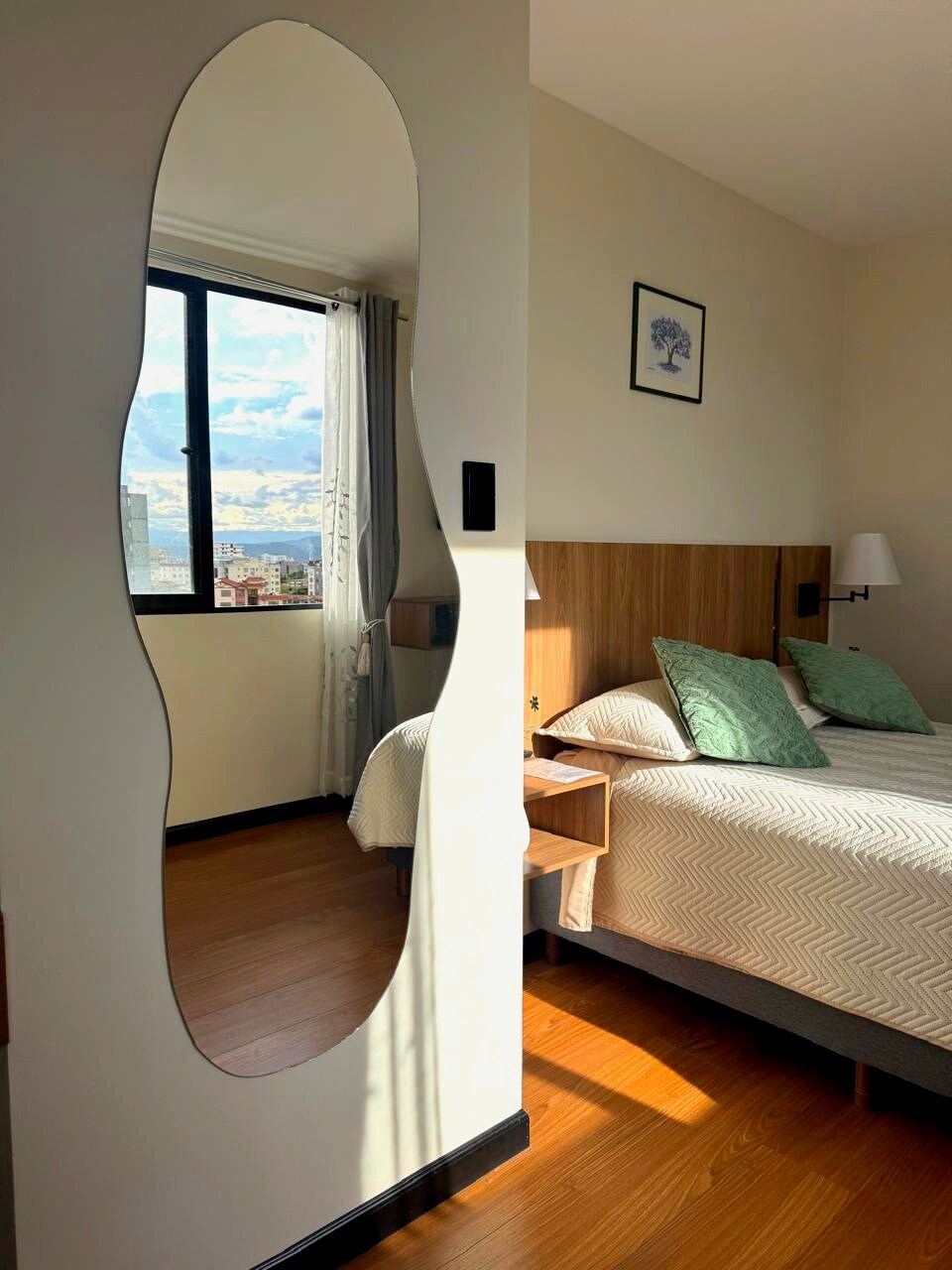 Enjoy a stylish experience at this centrally-located place. Our apartment is beautifully decorated with costume handmade furniture made in Bolivia. Located in the best area in Cochabamba surrounded by parks and a stunning view of the mountains and the Cristo. Walking distances to coffee shop, wellness yoga center, saturday local fresh markets, restaurants, public transportation, university, and so much more.
