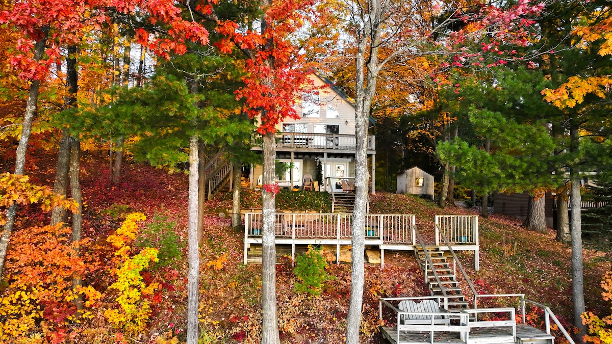 美しいアローヘッド湖の素晴らしい景色を楽しめる、景色の良い快適な湖畔の家 メインレベル: 玄関/ランドリー クイーンベッド付きゲスト用ベッドルーム#1 フルバスルーム バー&湖の景色が見えるキッチン 湖の景色を眺めることができるダイニングエリア 大きな窓から湖の景色が見えるリビングルームと2つのソファベッド 薪ストーブ・暖炉 上階: キングサイズベッドとフルバスルーム付きのマスターベッドルーム フルサイズベッド2台を備えたゲスト用ベッドルーム#2 布団2台と湖の景色を楽しめるロフトエリア