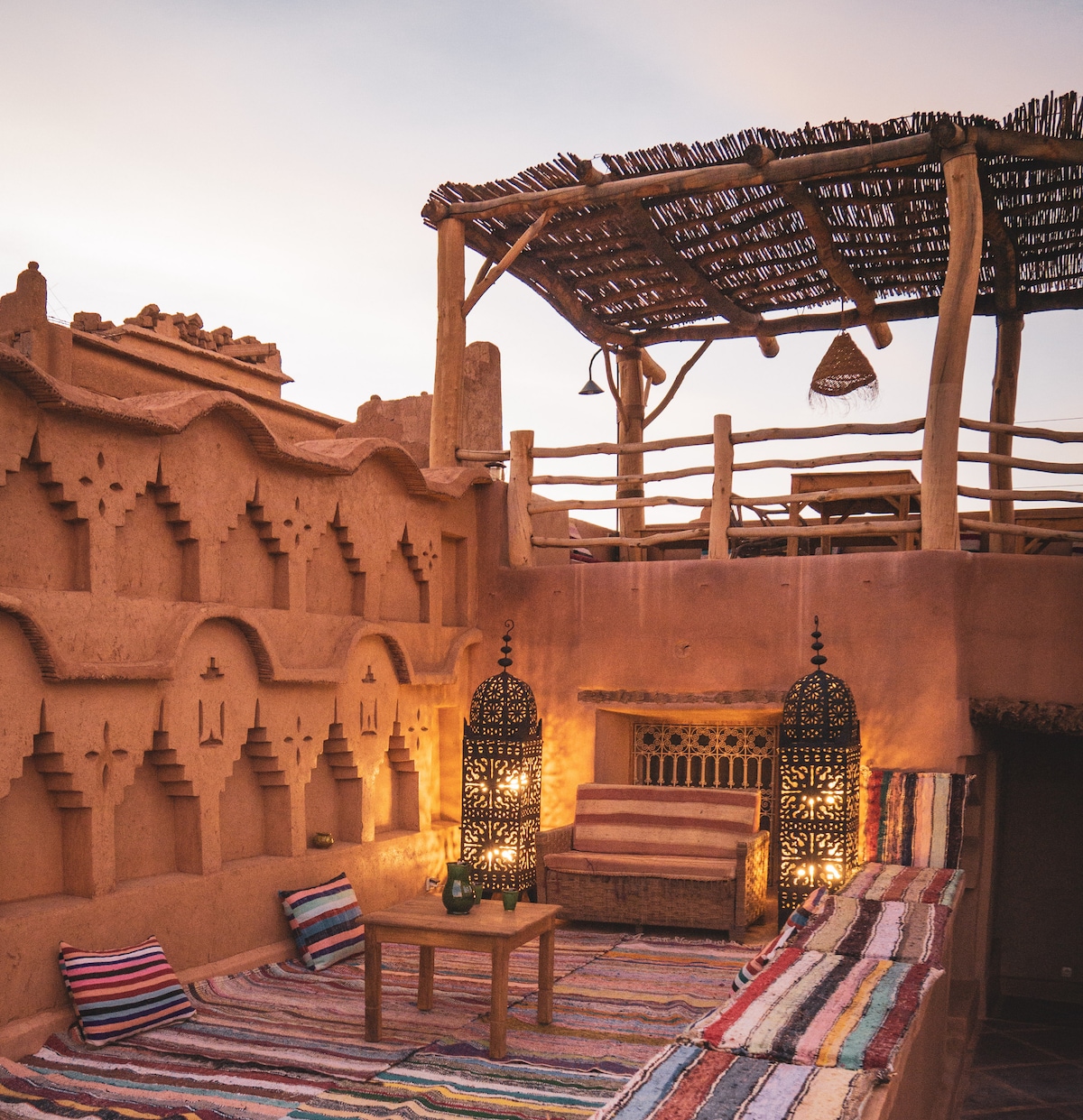 サハラ砂漠の端にあるアトラス山脈の南にあるスコーラの緑豊かなオアシスを見下ろすダルファラチャは、伝統的な素材と現代的なスタイルを融合させた、ベルベル人の家です。