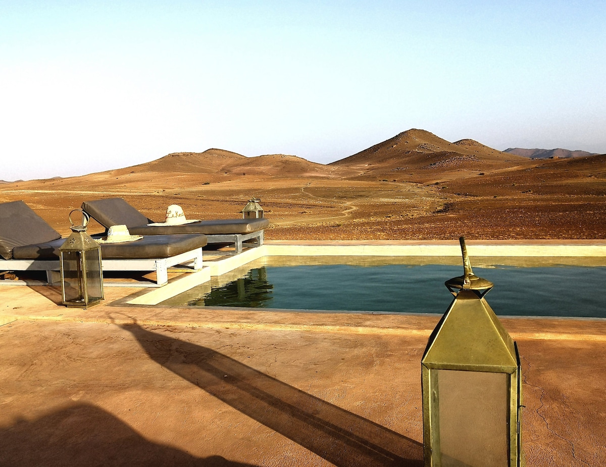 ループは建築家が設計したユニークな家で、アトラス山脈の息をのむような180度の景色を眺めることができます。 ループはエネルギー自給自足で環境に優しいです。 1ヘクタールの壮大な庭園と大きなインフィニティプールに囲まれています。 落ち着いて平和な雰囲気で、リラックスするのに役立ちます。 12人以上のグループの場合、プライベートプールを備えた小さな木造家屋は、2名様で1泊120ユーロでご利用いただけます。