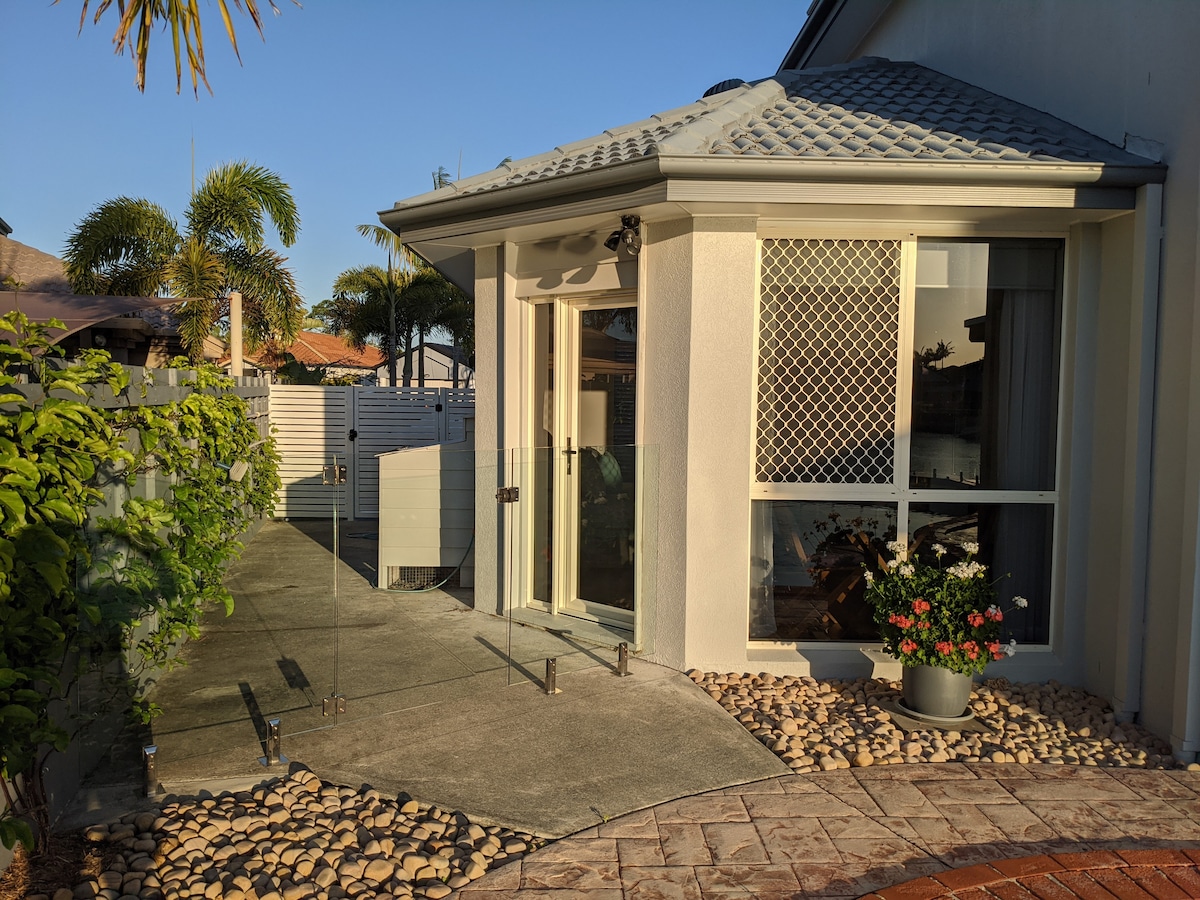 ゴールドコーストのあらゆるものの中心に位置する、新しく改装された、フレッシュでホリデー気分を促進する、豪華な自己完結型ユニットです。私たちの家の1階の袋小路に位置するこのユニットには、独立したサイドエントランス、Wi-Fi、安全なカーポート、夕日を眺めながらのドリンクや朝のコーヒーを楽しめるかわいいガーデンコートヤードがあります。ゴールドコーストのすべてのアトラクションにとても近い、静かな素敵な宿泊先です。 宿泊施設の所有者として、私たちはこのユニットの上に住んでいますのでご了承ください。