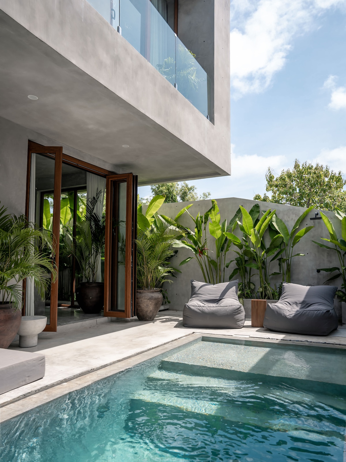 Brand New Designer Villa in Tranquil South Bali • Stylish air-conditioned bedroom with lush tropical views • En-suite bathroom with modern fittings • Large swimming pool surrounded by greenery — perfect for sunbathing or BBQs • Bright open-plan living room & fully equipped modern kitchen • 300 Mbps Wi-Fi for work & streaming • Daily cleaning with fresh towels & linens • Netflix & PS5, baby amenities & BBQ grill on request • Concierge service for airport transfer, scooter rental & more