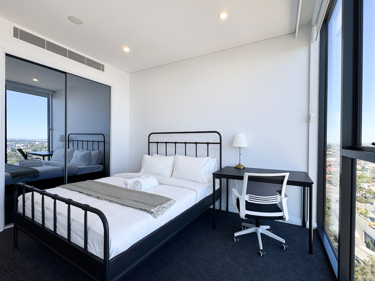 This modern 2-bedroom, 2-bathroom apartment offers a bright open-plan living area, a fully equipped kitchen. Guests enjoy complimentary access to the shared swimming pool and gym, along with secure free parking. Conveniently located just 12 mins drive from the airport, a 5-minute walk from Westfield Shopping Centre.