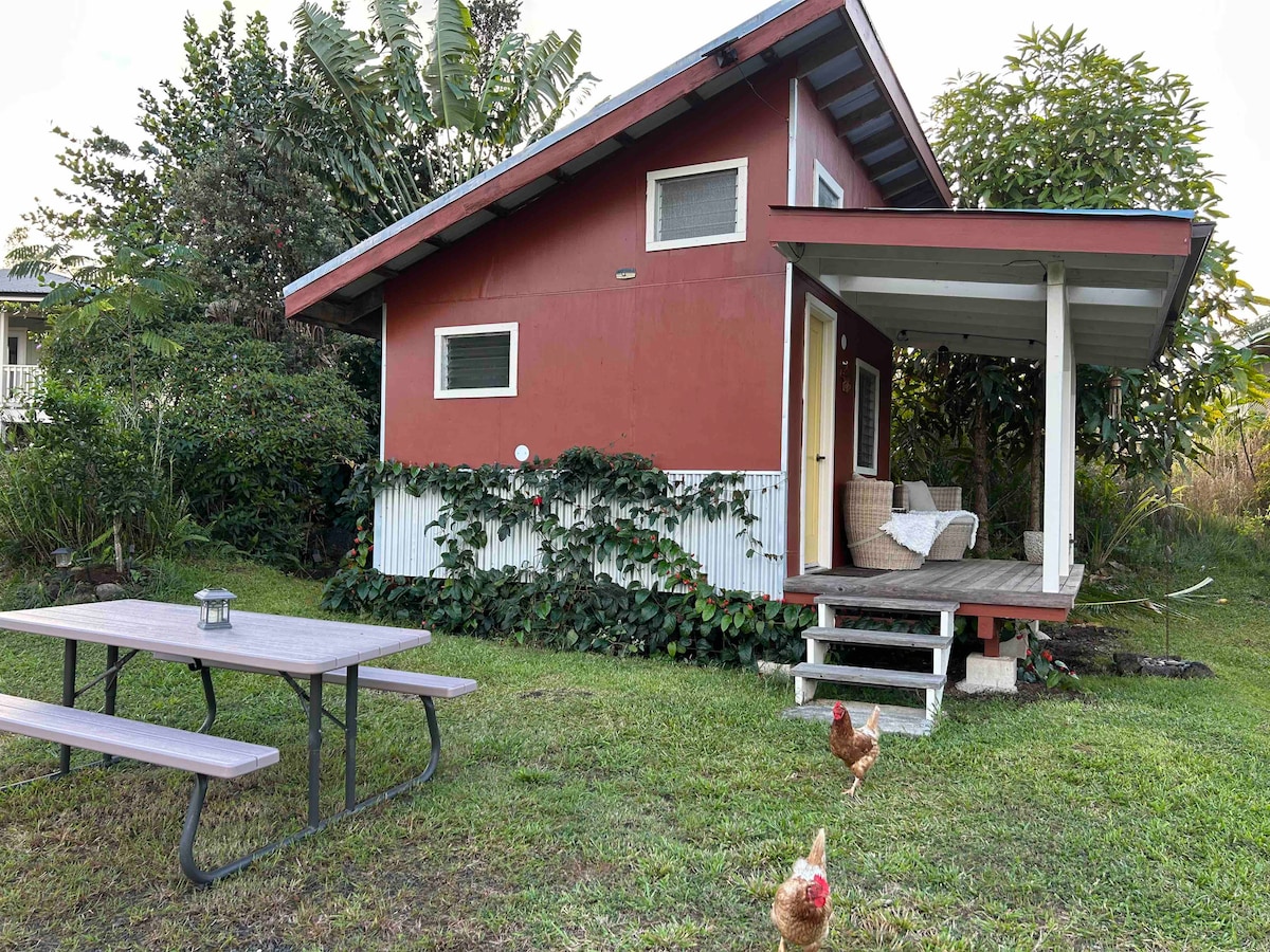 Licensed vacation rental on small banana farm 1 mi. from Kehena black sand beach, one of the least developed populated coasts in Hawaii. King bed, AC, full kitchen, screened lanai, outdoor shower & Jacuzzi bathtub/shower. Nearby viewing of the 2018 lava flow, swimming, snorkeling, hiking. Located in rural Kalapana Seaview neighborhood. Nearest store 10 mins, town with services is Pahoa, 20 mins away. Hilo, 45-60 minutes away. Volcano Park 1 hour. All of island accessible for day trips.