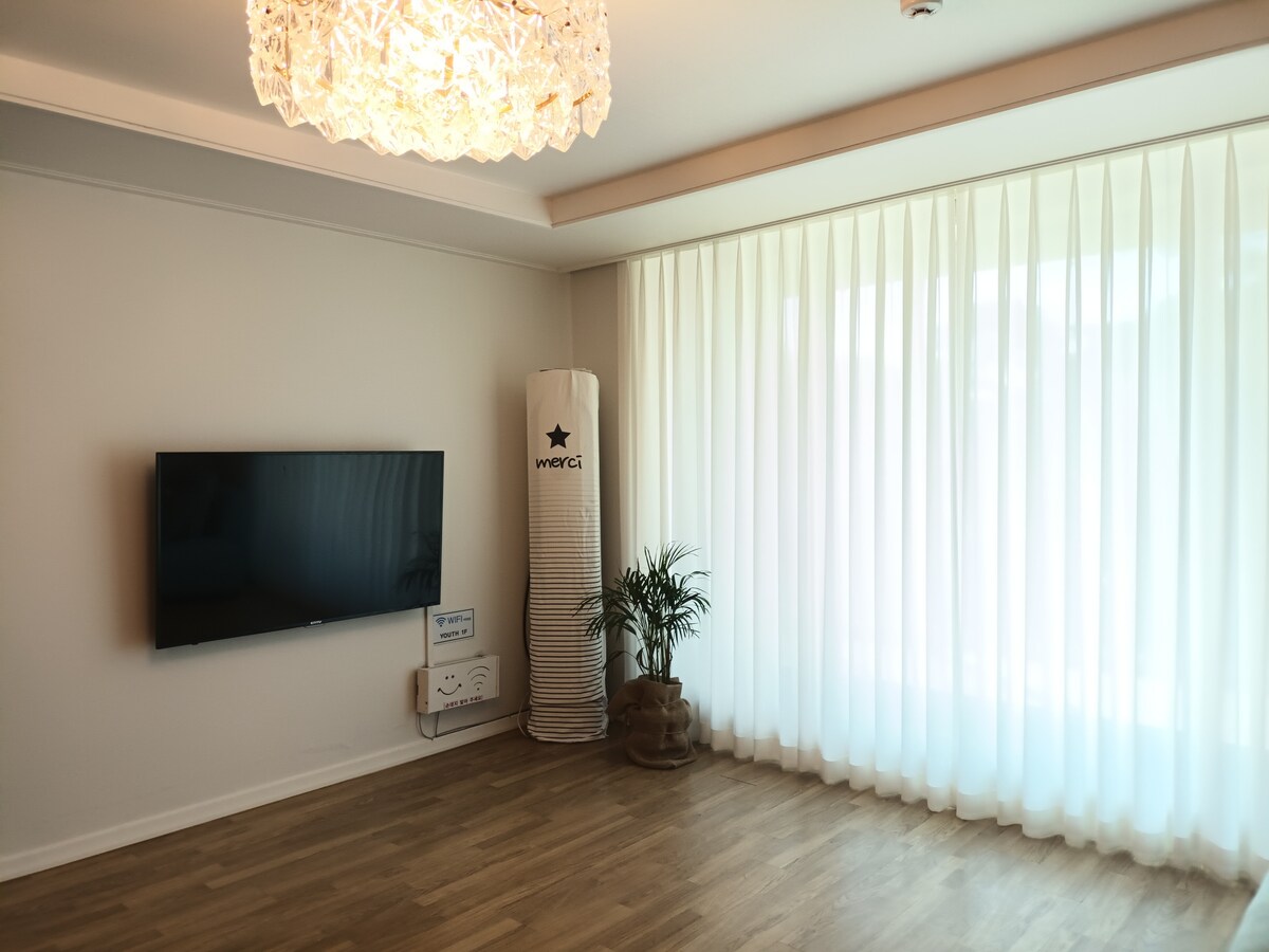 後ろには裏山の松林が見え、左側には龍州書院と約200坪の庭園があり、前方には静かな田舎の村の景色が見えます。 庭はまだ未完成なので、花や木を植え続けています 晴れた日には遠くに北漢山も見え、春夏秋冬の季節に応じて美しい花や木々を楽しむことができます。 静かで落ち着いた宿泊施設なので、心身ともにリラックスして休むことができます。 1階も隣の家も前の家も向かい合わないので、非常に独立しており、プライバシーが保証されています インテリアはシンプルなものを好み、白と無彩色で飾られています。 小型ペットの同伴も可能で、座布団2枚とフードボウル1個をご用意しています ビームプロジェクターとカラオケバージュース機 マイクはワイヤレスマイクを含む2台あります テラスと庭につながる雲の橋を設置し、庭と景色を楽しむのに便利になりました 夏に向けて扇風機、エアコン、除湿機、交差風扇が2台あります 日々アップグレードされる徳恩ペンションです
