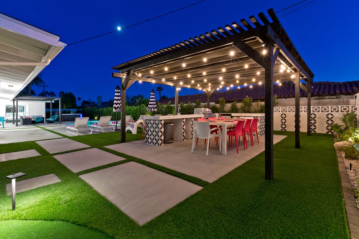 このトラウズデールにインスパイアされた、ミッドセンチュリーの3ベッドルーム/2バスルームのバケーションホームは、屋内と屋外の両方の生活を最高のものにしてくれます。 素晴らしい山の景色、パームスプリングスで最高の天気、ショッピング、レストラン、その他のエンターテイメントに近い静かなエリアの一流住宅街の他の物件の中でも際立っています。 パームスプリングスのすべてのバケーションレンタルに適用される地方自治体の12.5%の税金については、以下の重要な注意事項をご覧ください。