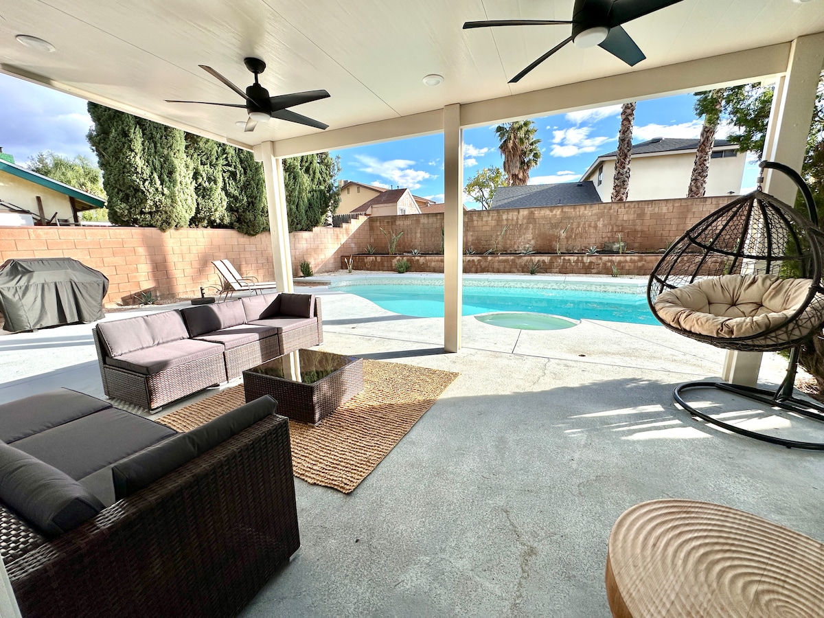 プール付きの広々とした3ベッドルームの隠れ家。 この美しく装飾されたレンタルには、3つの寝室、2つの改装されたバスルーム、プライベートプール、スパ、ホットタブを備えた裏庭のオアシスがあります。屋外キッチンにはガスグリルとブラックストーンの鉄板があります。 天井ファン、サウンドシステム、70インチテレビを備えたカバー付きのリビングスペースでリラックスしてください。屋内では、豪華なシアター座席、サラウンドサウンド付き75インチテレビ、裏庭へのスムーズなアクセスをお楽しみいただけます。パームデールからわずか10分、完璧な休暇先です!