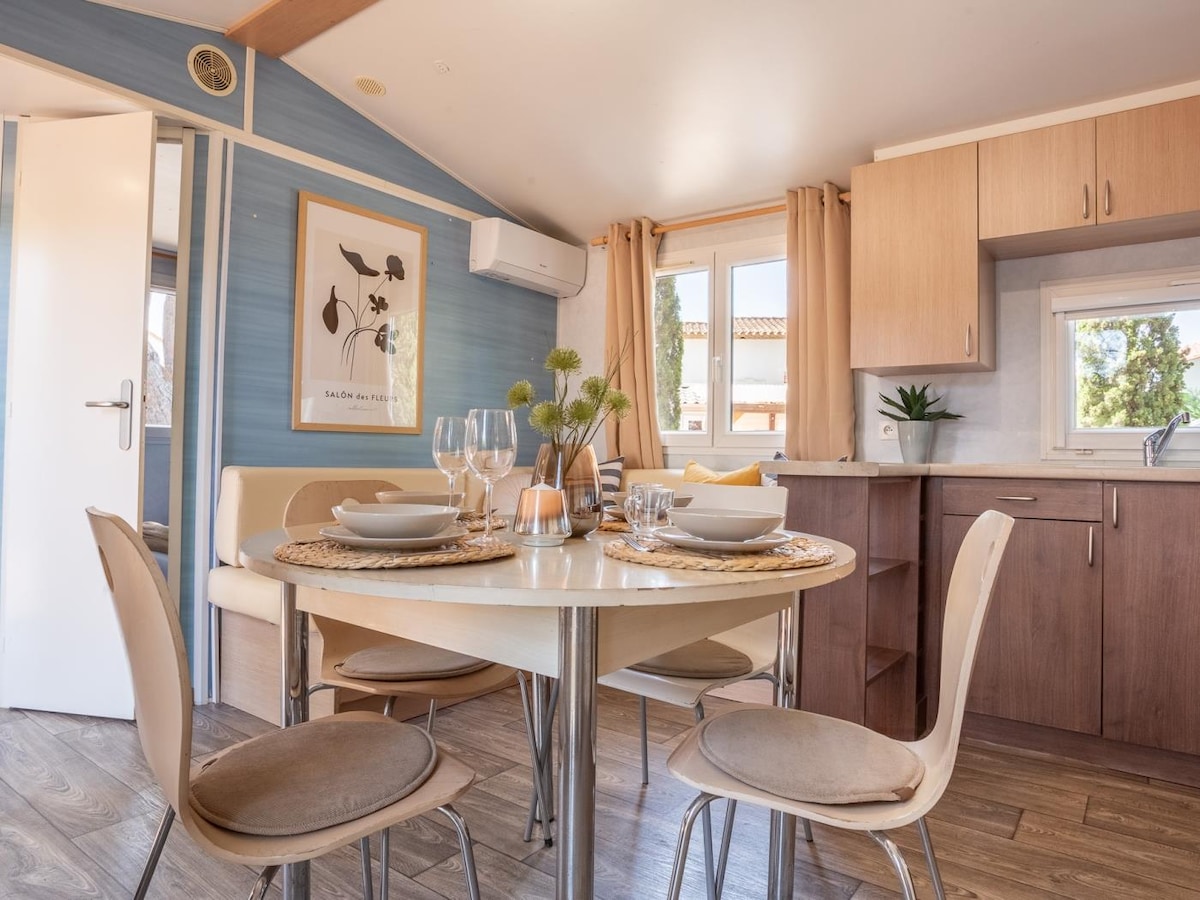 Forest Bungalow: Modern and practical Enjoy the comfort and atmosphere of L'Escala. Located in Camping Lacus, this bungalow offers a strategic location in the town center, ideal for a dynamic holiday just 750m from Riells beach, the lively promenade, and the marina. Forget the car; everything is within walking distance: supermarkets, shops, restaurants, bars, and your pets are welcome to join you. A functional and comfortable bungalow as the perfect base for your explorations.