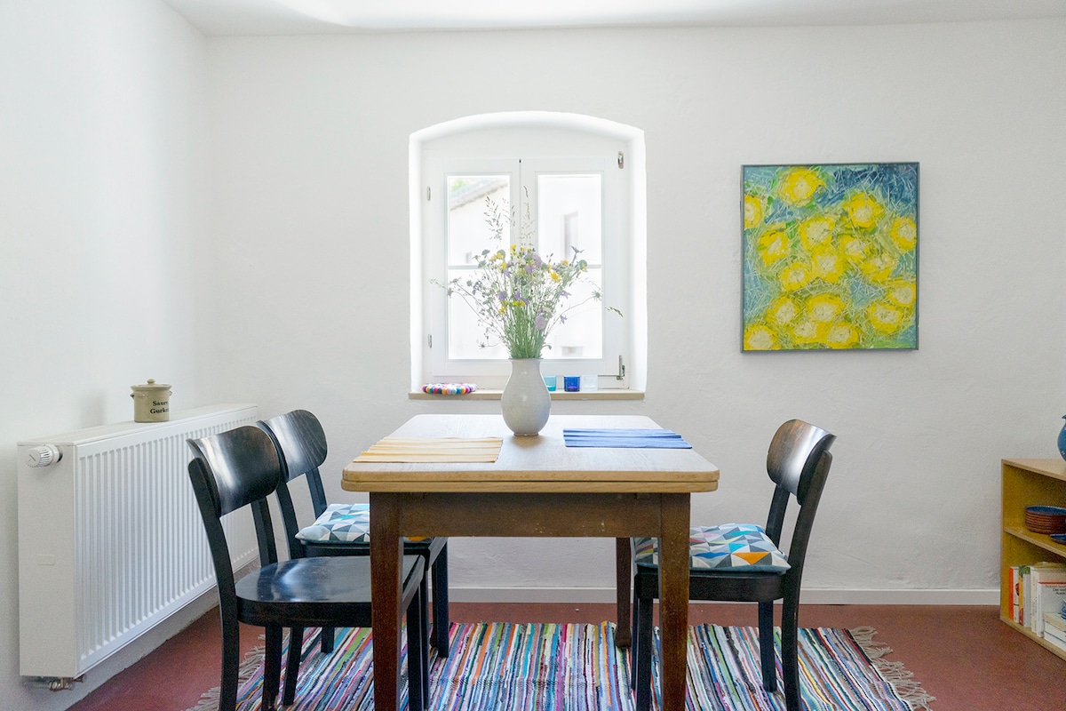 アルトミュールタール自然公園の記念碑(1階)にある2.5部屋のアパートを貸し出します。 74平方メートル、キッチン(最大8人用の引き出しテーブル)、リビングルーム(ソファベッド付き)、ダブルベッドの寝室(ボックススプリングベッド180 * 200)、ベビーベッド、バスルーム、屋根付きバルコニー、掃除機用収納スペース、アイロン台など。 テレビ、CDプレーヤー、ボーズブルートゥースボックスがアパートにあります。