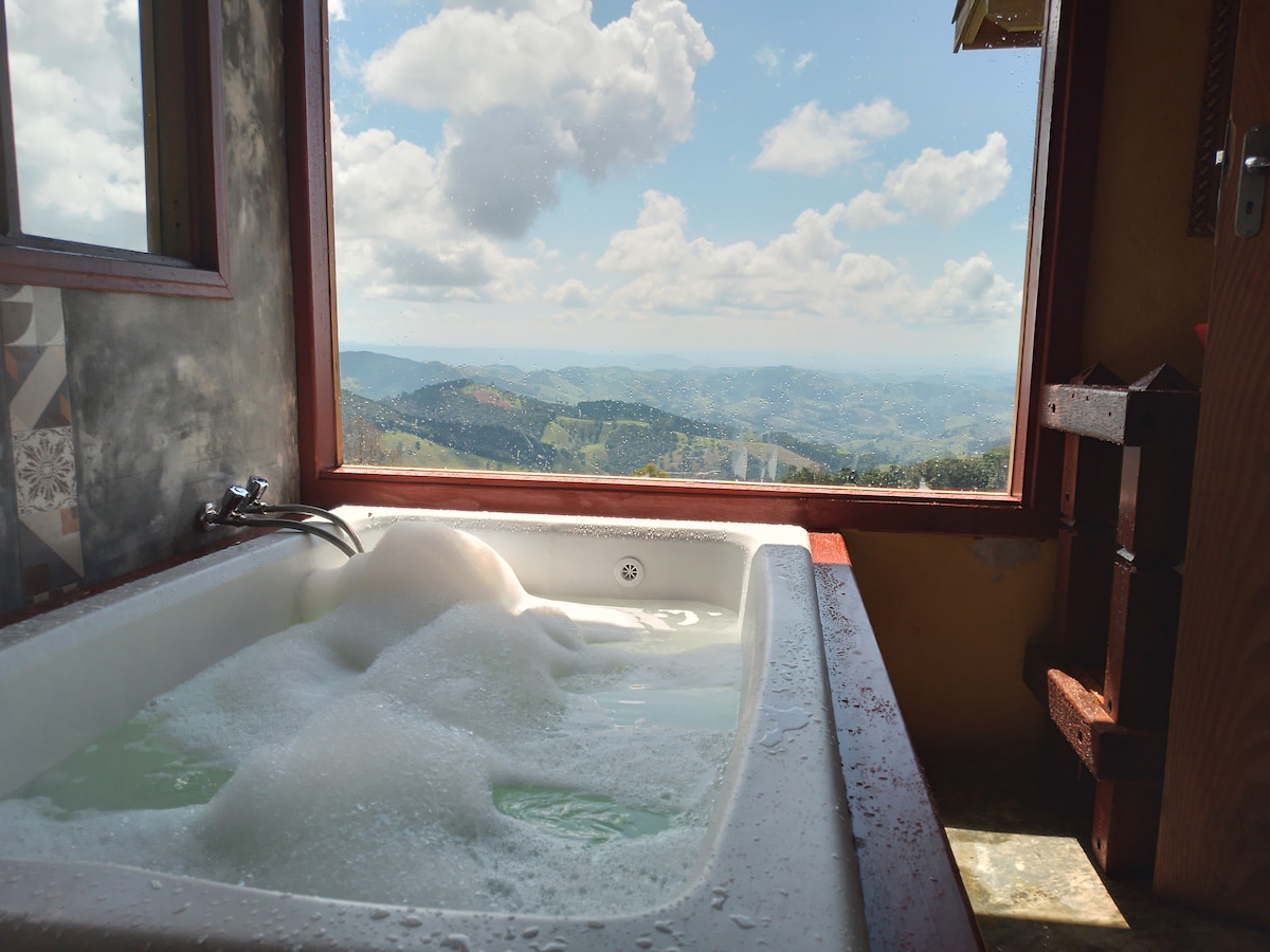 緑豊かなシャレー・アルト・ダ・ペドラ・ブランカは、文字通り山の中、マンチケイラ山脈の1,400メートルの高さに位置しています。 ミナスジェライス州南部のパライソポリスに位置し、サン・ベント・ド・サプカイとゴンサウヴェスの街の間にあります。 山で素晴らしい日々を過ごしたいカップルに最適な場所です。 そのために、静かでプライベートな場所にパノラマビューのバスタブを提供しています。 日の出と忘れられない星空をお楽しみください!