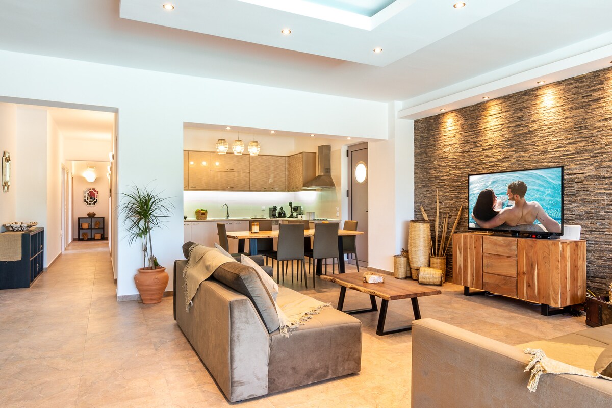 海に面した豪華なヴィラ。プライベートパーキング、庭園、そしてアファンティの美しいビーチの景色を楽しめます。海からわずか90メートルの距離にあり、南東に面しており、一日中太陽と光に浴び、夜の海風があなたをリラックスさせます。カップル、子供連れの家族、友人、若者グループに理想的な場所です。アファントス島のゴルフ場の隣にあり、島の観光スポットにも近く、島の中心部に位置し、アクセスも簡単です。