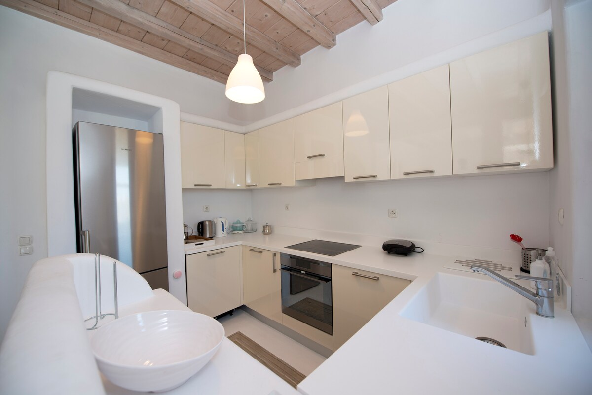 Blueisla Modernミコノスタウンハウス! 町にある専用駐車場付きの家です。 この新しく改装された家は島の静かなエリアにあり、エーゲ海の息をのむような景色を眺めることができます。 この家には、必要なアメニティがすべてアップグレードされており、ミコノスの町の絵のようなパノラマビューが楽しめるテラス、そして暑い季節でも家の換気を保つエアコンが備わっています。
